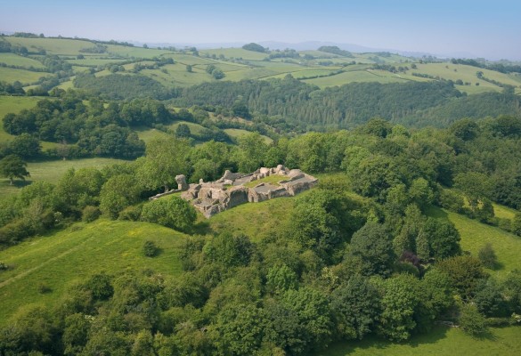 The impressive remains of Dolforwyn Castle in modern day Powys occupy a wooded ridge above the River Severn. From the top you get magnificent views along the valley, as the great river flows from the Cambrian mountains in the East, through Northern Powys towards the border with England.
